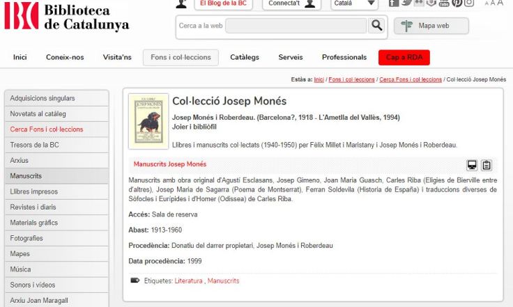 Biblioteca de Catalunya : la resta de llibres, mecanoscrits i edicions de bibliòfils, estan dipositades en aquesta institució :