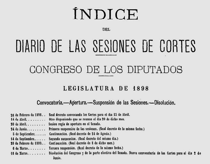A la portada del “Índice del Diaro de las Sesiones…” es veu amb detall el període de sessions i els intervals entre elles.