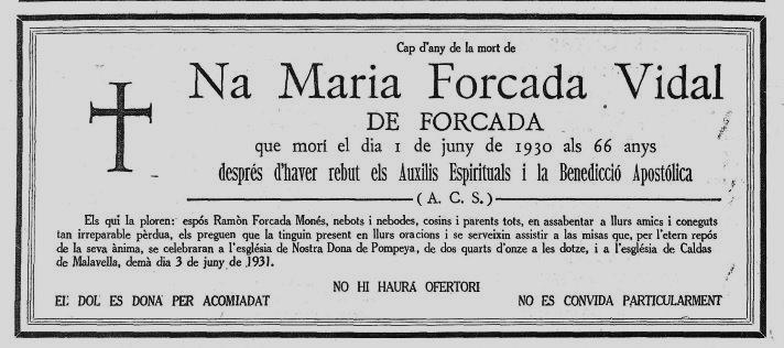 Cal remarcar que l’any 1931, ja vidu, presenta expedient al Jutjat de “Atarazanas” de Barcelona, per iniciar els tràmits d’adopció del seu nebot Ramon Forcada Ramoneda, inscripció que consta al costat de l’acta de naixement d’aquest nebot, al Registre Civil de Sant Feliu de Codines; reproduirem aquest document en l’entrada corresponent a en Ramón Forcada Ramoneda.