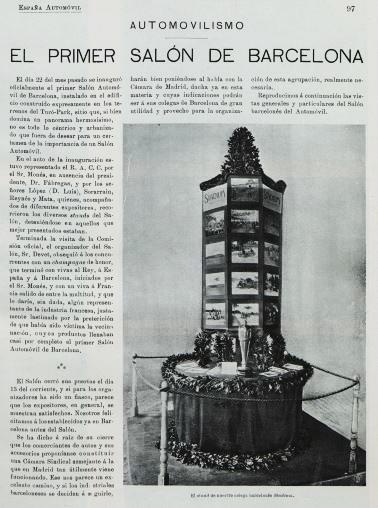 “Aunque la primera edición del Salón Internacional del Automóvil de Barcelona no tiene lugar hasta 1919, la Exposición de 1913 que parte de iniciativas individuales es un importante precedente que muestra el interés creciente por el automóvil en la Ciudad Condal. Entre esta Exposición y la primera edición oficial del Salón transcurrieron seis años”.