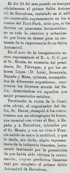 Reproduim la noticia a la premsa de l’època (d’aquest saló de 1913) en que hi consta la participació del Sr. José Pedro Monés y Mauri, persona destacada de la societat barcelonina, i del qual tindrem ocasió de comentar la seva presencia en diferents institucions; en aquest cas formava part de la Junta Directiva del “Real Automóvil Club de Catalunya Racc” en diferents anualitats.