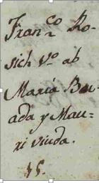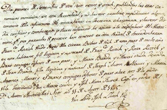 A l’acta hi reproduïm les dades principals : “Dia primer de setembre de mil vuit cens y sinch…”, “…Francº. Rosich viudo pages de la Cirera Bisbat de Vich de esta parr? de molts ans en esta habitant…”, “fill llegitim y natural de Francº. Rosich y Rosa Rosich y Baro conjugues difunts de una part…”,”…y Maria Buada y Mauri (1770-XX) vidua dexada de Joan Buada, filla llegitima y natural de Joseph Anton Mauri y Maria Antonia Mauri y Frexes conjuges difunts…”; cal esmentar que en el moment d’aquest matrimoni tots dos son vidus.
