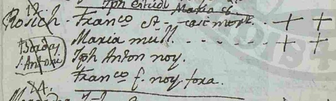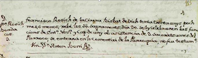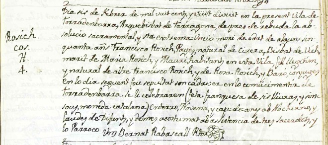 Sembla que al costat del nom d’ell hi digui “casi mort” o potser ja tenia una malaltia greu; (l’acta eclesiàstica d’enterrament es del 6 de febrer de 1818) hi figuren també Maria la seva muller, en Josep Anton fill, i en Francisco fill (que indica fora, per tant absent).