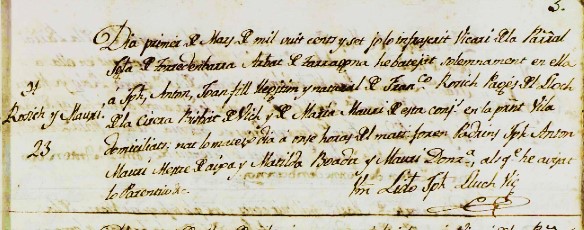 Un cinque registre es el del nou casament (l’u de setembre de 1805), just tres mesos despres de la mort de la seva primera muller; potser amb ulls d’avui això pot semblar com molt apresurat, però en l’epoca de principis del segla XIX, els casaments es feien amb un sentit mes practic, i en aquells moments en Francisco Rosich estava sol i amb un fill…).