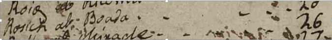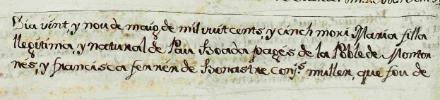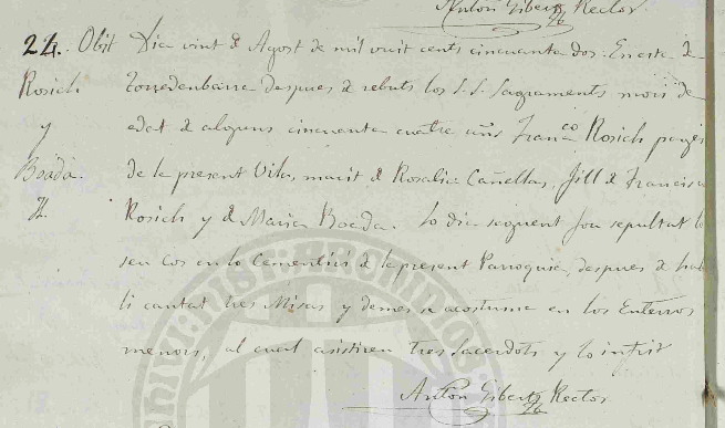 “Dia vint y nou de maig de mil vuit cents y cinch mori Maria filla llegitima, y natural de Pau Boada pages de la Pobla de Montornes, y francisca femnén de Bonastre conjuges muller que fou de Francisco Rosich de la Cirera, Bisbat de Vich: tenia trenta anys poch mes o menos; rebé los SS Sagraments. dia 30. se ly celebranen les funcions de ? novena y cap de any ab asistencia de 3 sacerdots ames del Parroco: se enterrá en lo cementiri de la Parroquia: no feu testament”
