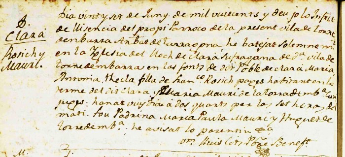 Localitzem el seu baietig a la diapositiva 86/757 del Llibre de baptismes de 1806-1836 (es batejada a l’esglesia de Clará, depenent de la de Torredembarra):