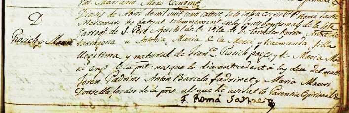 “…Dia primer de mars de mil vuit cents y set…”, “…nat lo mateix dia a les 11 hores del mati…”, “…foren padrins Jph Anton Mauri, mestre d’aixa y Matilda Boada y Mauri donzella…”