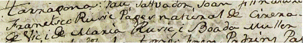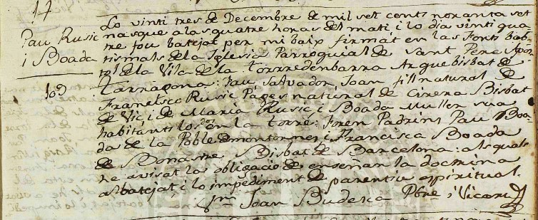 Un primer registre d’ell el localitzem en l’acta de naixement del seu fill “Pau, Salvador, Joan”, nascut el 23 de desembre de 1797, i batejat el dia seguent (diapositiva 352 del llibre de baptismes de 1787-1806, Parroquia de Torredembarra) :