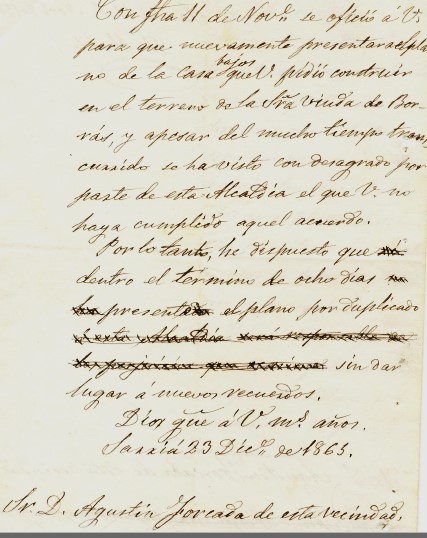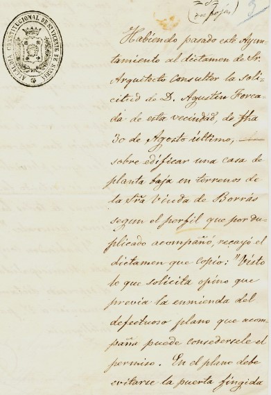 Unes curiositats d’aquesta resposta de l’Ajuntament : a) al segell de l’Ajuntament encara posa de “San Vicente de Sarrià”, reminiscència i origen de l’església (feligresies) en la definició dels terminis dels ajuntaments; b) La resposta s’adreça inicialment al mestre d’obres “…Sr. D. Jayme Feliu (y Castelló) Maestro de Obras por la R. Acadèmia de San Fernando…”. Durant molta part del segle XIX els Mestres d’obres seran els encarregats de fer els plans i la supervisió de les obres, fins la col·legiació dels arquitectes (1930).