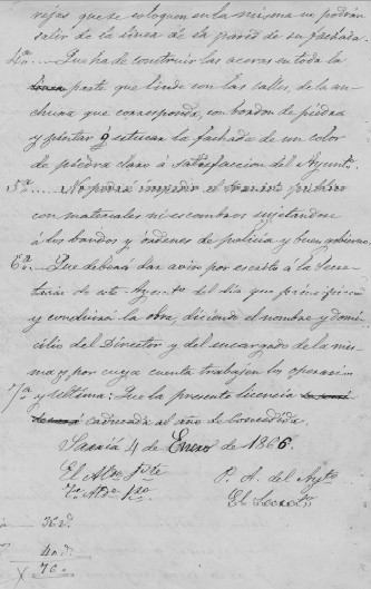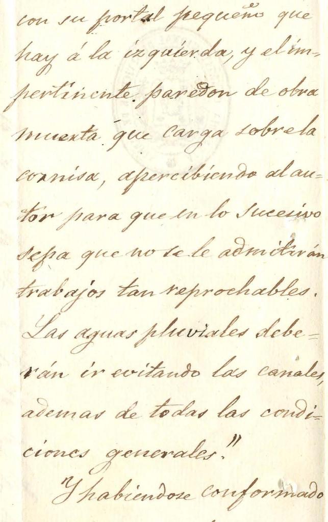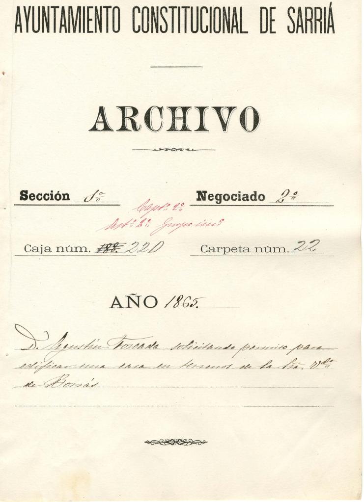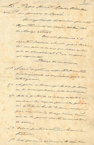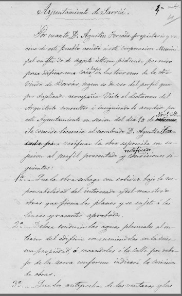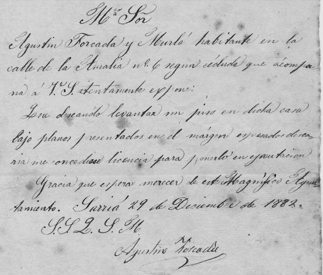 “…D. Pablo Amat Casas, Alcalde accid. (accidental) del pueblo de Sarriá.// Cumpliendo lo acordado por este Ayuntamiento la sesión ¿del día seis de marzo actual.// Concedo permiso a D. Agustín Forcada Murla para levantar un piso en la casa que posee en la calle Amalia número 6 con sujeción al siguiente.// Pliego de condiciones.// 1ª. Deberá sujetarse al perfil presentado devolviéndosele el duplicado para su inteligencia.// 2ª. No podrá interrumpir la vía publica con la manipulación de los materiales.// 3ª. Deberá quitar los canelones ¿ y conducir las aguas pluviales por medio de tubería hasta la línea en posición hasta la línea en primer piso empotrando luego dicha cañería en la pared hasta el nivel de acera.// 4º. Deberá pintar o estucar la nueva fachada.// 5º. Este permiso caduca a los seis meses de la fecha.// Dado en Sarriá a treinta y uno de marzo de mil ochocientos ochenta y tres.”