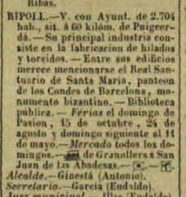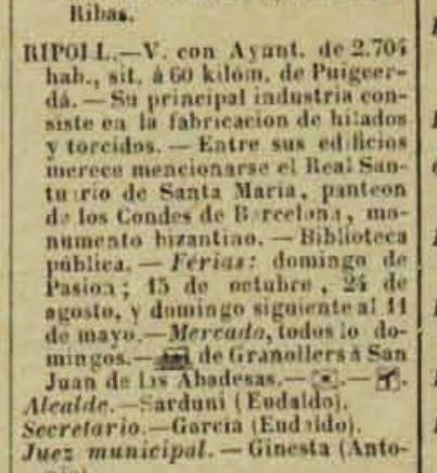 A el “Anuario del Comercio, de la Industria, de la magistratura y de la administración”, edició del 1884, pag. 951, corresponent a Ripoll :
