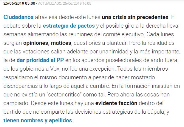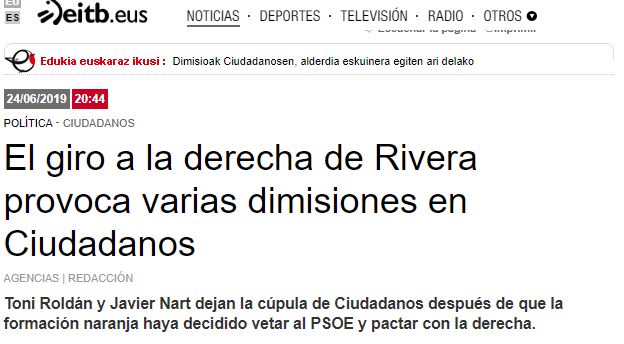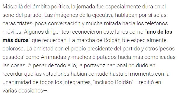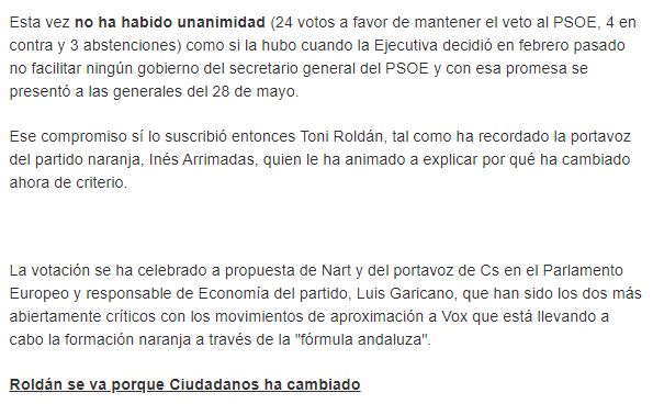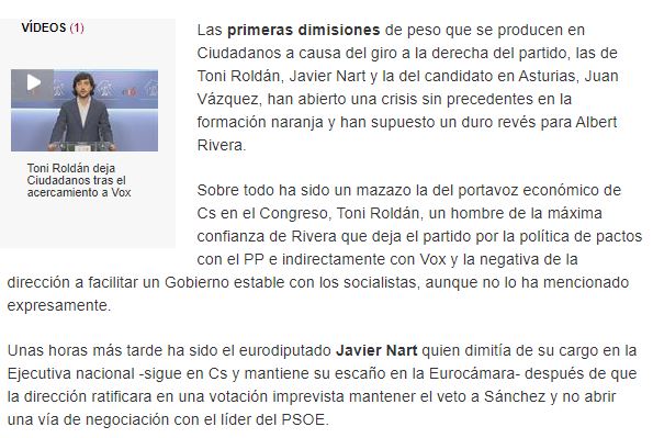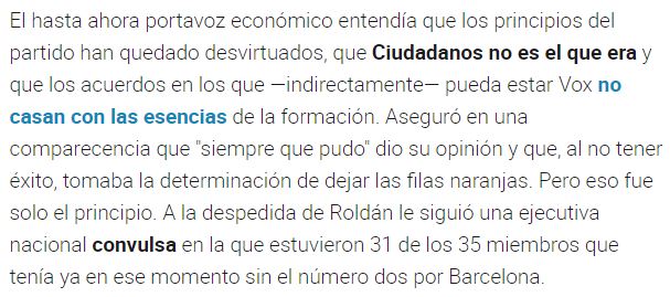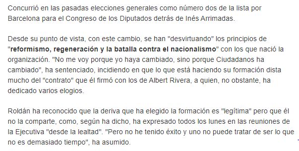 A l’entrada M15, ja vaig comentar que, en Toni Roldan Monés que s’havia presentat com a número 2 a la candidatura de “Ciudadanos” per Barcelona, havia estat escollit, a les urnes, nou Diputat. Consta al Registre del Congrés, a partir de la data del 20 de maig de 2019 i de baixa el dia 26 de juny d’aquest any, després d’haver presentat la seva dimissió, així com de la resta de responsabilitats directives que tenia dins el Partit.
