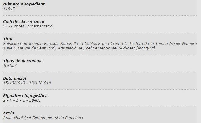 Consultant el “Arxiu Contemporani de Barcelona” localitzem aquest expedient de 1919, respecte d’un ornament que demana per posar una creu a una tomba del Cementiri de Montjuich :