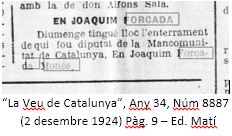 “diputatsmancomunitat.cat” dient “…la figura de Joaquim Forcada és realment poc coneguda i en tenim poca informació. A banda de la seva activitat política, només sabem que era propietari, tal com consta als anuncis de premsa de la Candidatura Autonomista Republicana per a les eleccions de 1909…”