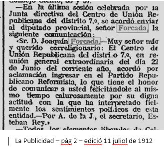 El gener de 1915 fou escollit president del Centre d’Unió Republicana del districte VII, on ja el 24 de juliol de 1912 s’hi havia celebrat un acte de suport i homenatge a Forcada, amb dos-cents assistents.