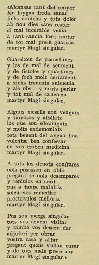 Hi han uns primers goigs del Sant, impresos l’any 1528 (fa 490 anys), segons una reproducció -molt difusa- que he localitzat a la Revista “Arxiu de Tradicions Populars”, pag. 35 numero 2 de 1928, i que en reproduïm la portada, i els goigs :