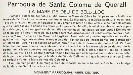 AFEGITÓ 23.03.2020 : Amb la finalitat de poder complementar la imatge de la Mare de Deu de Bell.lloc, reprodueixo retall del full de la “Parròquia de Santa Coloma de Queralt” ( de l’abril de 1980), on es fa esment que el veí colomí en Ramon Sendra ha tallat en pedra una imatge de la Mare de Deu.