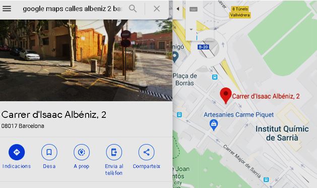 En primer lloc, anem a “google maps”, indicant l’adreça i la població que estiguem cercant, i despres a la pagina de”google” indiquem la pestanya “maps” a la barra lateral superior del cercador; si la cerca ha estat acurada, ens indicará amb una senyal el lloc on es troba aquest indret :