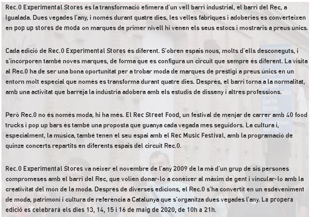 Però al Rec si ve, també, a gaudir, a deixar-se seduir per els racons, les botigues, les ofertes, o les sorpreses d’allò que no hi comptaves; també hi ha espais per a gaudir del repós, de l’ápat, de l’entrepà o la tapa, que situats estratègicament, ajuden a recuperar forces, a valorar les compres o les vivències assolides.