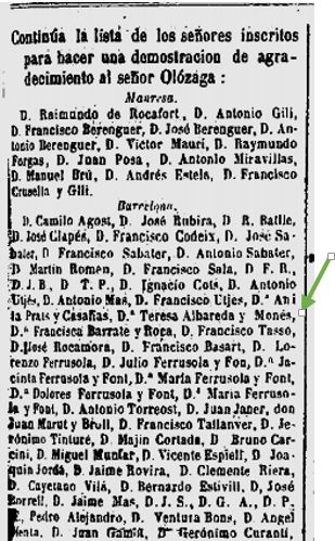 No he localitzat més dades sobre el naixement, matrimoni, i/o fill(s), o la defunció de la Teresa Albareda; nomes podem intuir que es tractaria d’una persona instruïda, implicada i coneixedora del mon polític i social, amb independència i recursos econòmics (tant per via d’herència, com per haver quedat vídua, extrems que en cap cas podem ratificar). En aquesta llista d’agraïment hi apareixen aproximadament un 40 per cent de dones, fet prou important per a la societat de la Barcelona de mitjans del segle XIX, anterior a l’expansió que promourà el Pla Cerdà.