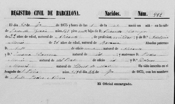 Sabem del seu naixement que va ser el dia 20 de juny (el mes queda poc definit ja que esta abreviat), de 1875 al Passeig de Gracia 147?, on deurien viure, i els seus pares tindrien 32 i 21 anys respectivament.
