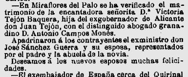 Al 1905 es casa a Málaga amb Victoria Tejon Baquera, el dia 18 de setembre de 1905, a la capella dels Jesuites de Sant Estanislao el Palo (Malaga), amb Victoria Tejón Baquera, filla del Senyor Juan Tejón Marin, militar, politic (breument la seva biografia es molt complerta : va acabar els seus estudis a l'”Academia de Ingenieros” (1882), demana una excedencia (1885); es Alcalde de Cordoba (1891), es reincoprora a l’Exercit destinat a les Illes Filipines on participa en diferents accions de guerra, retornant a la peninsula (1897). Es Gobernador Civil de Girona (1902), d’Alacant (1903) de Granada (1904) -cessant el 1905 per la defunció de la seva dona-; Governador Civil de Zaragoza (1907) participa activament en els esdeveniments de la Fira Hispano Francesa, i se li otorga el reconeixement de “Gentilhombre de Camara del Rey Alfonso XIII”; torna a ser Gobernador Civil de Granada (1913), de Valencia (1914), fins a final de 1917 en que trobant-se malalt torna a Madrid, on mesos despres mort).