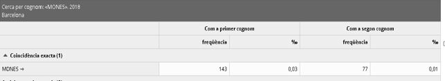 - Revisats altres cognoms com “Munnes”, o “Monnes” no hi ha registrada cap persona; dels “Munes” ni hi ha menys de 4, dels “Monne” si hi ha 1.107 (510 de primera posició i 597 de segona posició del cognom) i de “Munne” ni hi ha 1759 (896 en primera posició i 863 en segona posició del cognom).