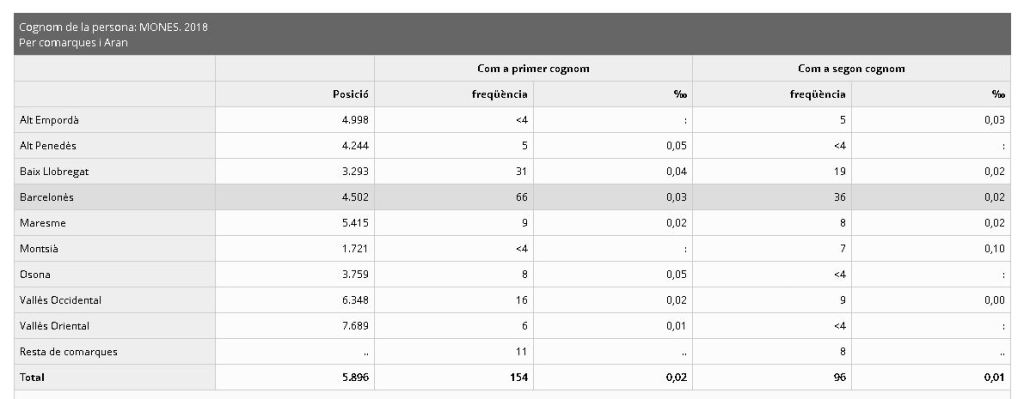 1. El nostre cognom es troba a nivell general, al numero 5.896 respecte dels mes utilitzats (en aquest any 2018, en te registrats 60.260 diferents); la segmentació per comarques ens dona la seva distribució :