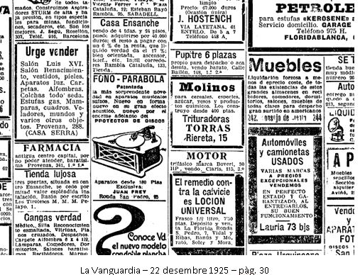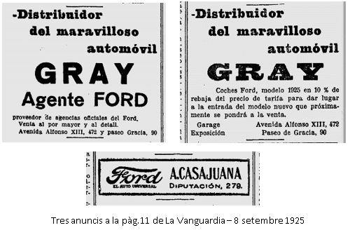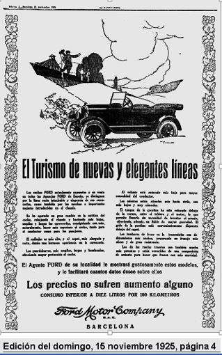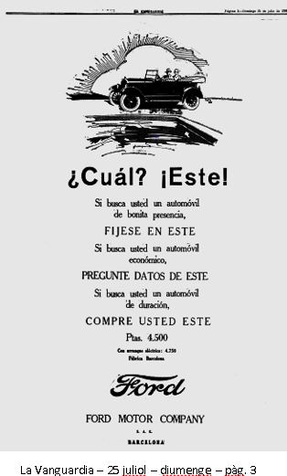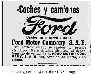 L’any 1925, la publicitat, en general, acostumava a esser informativa, i poc pensada cap a col.lectius determinats. Els anuncis de les Agencies Ford anaven en aquest sentit, i estaven inserides amb el nom el concesionari. Reprodueixo dues insercions, i una darrera generica del tipus d’anuncis habituals :