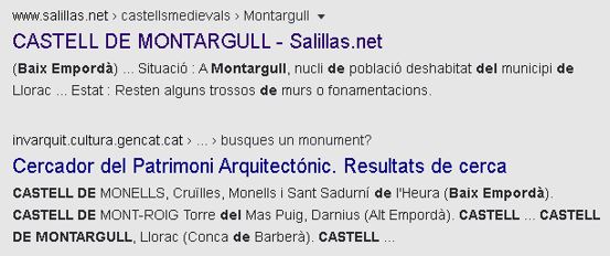 El cas es que en la pàgina de presentació del Castell de Montargull, hi figura “Castell de Montargull – Baix Empordà”; la resta d’informació, a l’índex, esta ubicada correctament. Però el “google”, treballa amb el que en diu “algorismes” (que comentem mes avall), i va recollint periòdicament informació de paraules clau per posar ordre i facilitar la tasca quan cerquem una informació.
