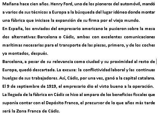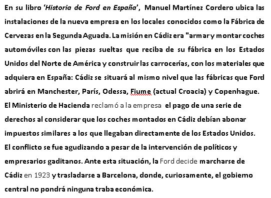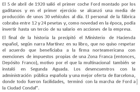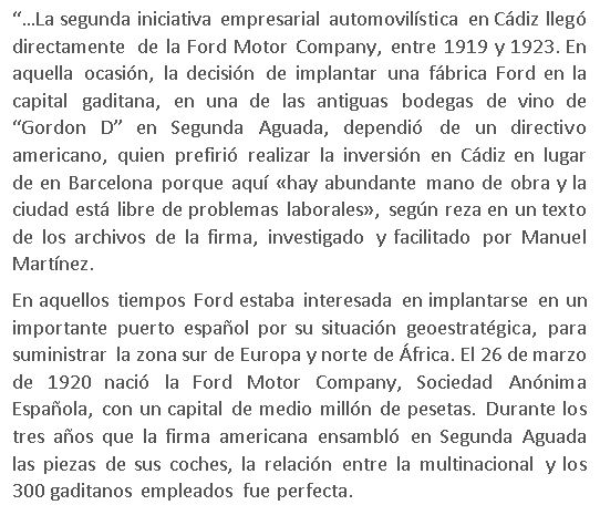 Es produeix el desembarcament de la Ford Motor Company a Espanya; hi ha un article de Mercedes Morales (“Breve história de la automoción en Cadiz” – “lavozdigital.es”), en que reflecteix aquesta primera etapa, i que reproduïm :
