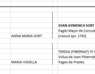 Joan Aimerich (pages de Cornudella del Montsant), és fill de Damià (pages de La Cirera), que el 1764 es casa amb Maria Sort (vidua d’un pagés de Prades, i filla d’un pages de Falset).Una altra branca dels Aymerich, de la qual en tenom documentat el matrimoni…