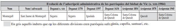 He localitzat aquest quadre, al llibre…, on es veu la adscripció de la Parròquia de Montargull, als diferents deganats (mentre es del Bisbat de Vic), i en gris hi apareix el període en que aquesta parròquia de Sant Jaume perd la jerarquia d’església, a favor de Rauric, suposem també per un increment de residents a Rauric, mentre que a Montargull, la població va minvant.