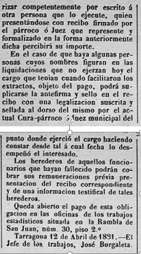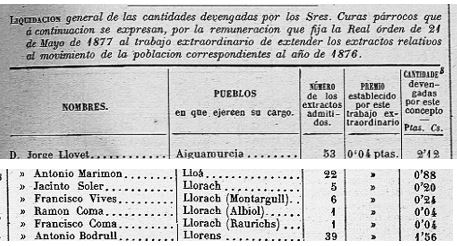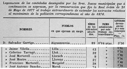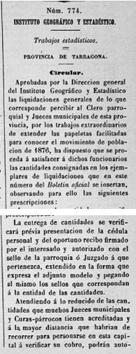En aquesta edició del DOP de Tarragona es publica la Circular del “Instituto Geografico y Estadistico”, amb la liquidació dels Mossens i Jutges Municipals per “… los trabajos extraordinarios de extender las papeletas facilitadas para conocer el movimiento de población de 1876…”.