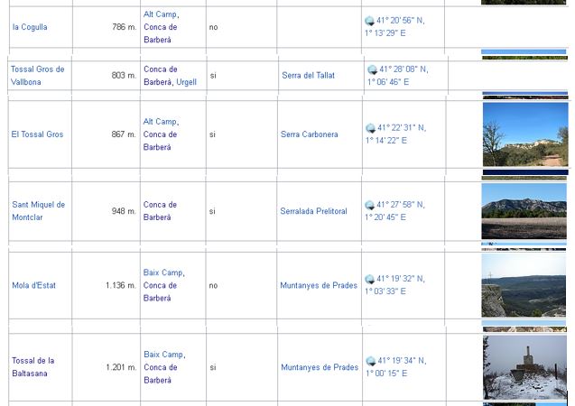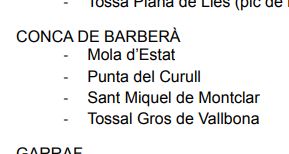He resumit de dues webs, el llistat d’aquells cims, que constem pertanyen a la Conca de Barbera, o en alguns casos en fan de limit amb altres comarques.