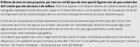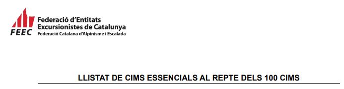 La segona selecció correspon a la pagina web de la FEEC (Federació d’Entitats Excursionistes de Catalunya), que al 2006 va plantejar el “Repte dels 100” per identificar aquells cims mes representatius, del nostre territori, que de forma oberta ha anat ampliant fins als 308 actuals, i a la vegada al assolir-los i coneixer les diferents comarques, aniant a complir aquest repte. Reproduim un paragraf dela web de la FEEC, per reforçar l’idea del projecte :