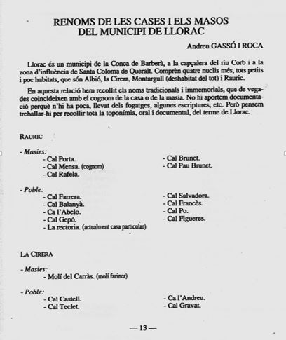 Reprodueixo integra l’article que he mencionat i es difícil retrobar-lo a la xarxa; va ser editat al “Butlletí Interior” de la “Societat d’Onomàstica”, al numero LVIII, de setembre de 1994, de les pàgines 13 a la 15 :