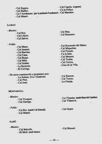 Al mon rural, identificar i ubicar, les diferents cases i masies es difícil, repartides arreu del terme municipal, i el nom de la mateixa relacionat amb els propietaris de la casa, o dels que ho havien estat com a mes representatius, es manté vigent; també als indrets urbans petits, hi ha aquesta identificació malgrat que les cases estan situades en carrers i números de casa, fàcilment localitzables.