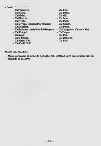 L’article que esta desglossat per els cinc indrets que formen el terme municipal de Llorac, distingeix entre les masies fora del poble, i les que hi pertanyen.
