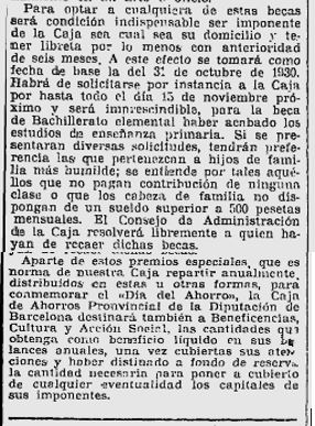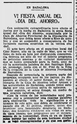 x El 9 de novembre es ressenya l’acte organitzat per la Caixa d’Estalvis Provincial a Badalona, concretament al “Cine Nuevo”, amb motiu dela Diada de l’Estalvi que s’havia posposat, per uns incidents ocorreguts a la ciutat; el programa del’acta va consistir en un pase de diferents pelicules entretingudes e instructives, que va reunir un nombros public que va omplenar el local.