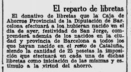 x El 24 d’abril hi ha la noticia de que la Caixa d’Estalvis Provincial obrirà un compte amb 25 Ptes. a tots els nens i nenes nascudes la diada de Sant Jordi.
