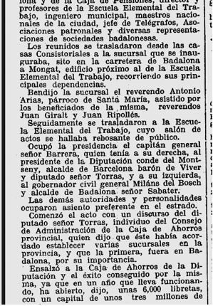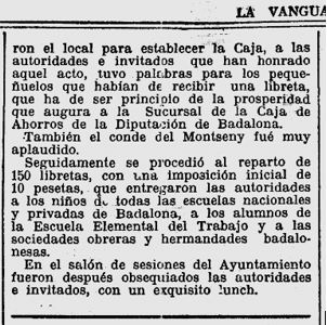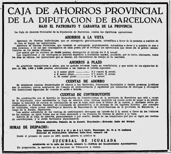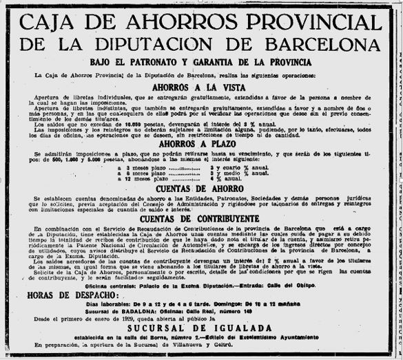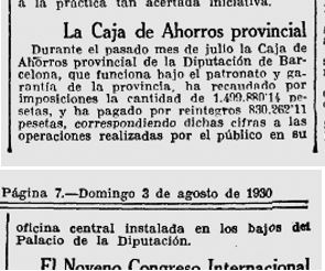 x El 25 de febrer de l’any 1930, es fa esment en el resum de l’accio feta per la Diputació, abans de la renovació dels Diputats Provincials, i especificament es menciona l’exit de funionament de la Caixa d’Estalvis Provincial, ara ja amb les seus obertes de Badalona, Igualada i Vilanova i la Geltru.