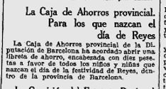 x El 24 de desembre del 1930, la Caixa d’Estalvis Provincial, estableix que tots els nens i nenes que neixin el dia de Reis a Barcelona o la seva provincia, tinguin com a obsequi una llibreta, amb una imposició de 10 Ptes,