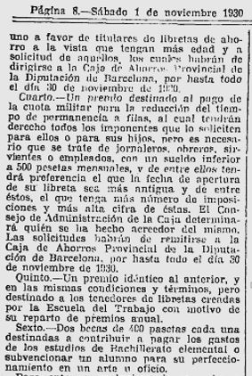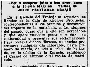 x El 20 de febrer, es fa esment dels premis i retorn de l’import de les matricules ala alumnes de l’Escola del Treball que en son acreedors, i que poden recollir les llibretes de la Caixa, a l’oficina de l’esmentada Escola.
