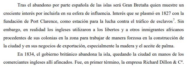 El 1827, Espanya va autoritzar la repoblació de l’illa per els anglesos, i Santa Isabel, es va convertir en “Port Clarence”, fins el 1845 en que Espanya va reclamar els seus drets i va retornar a la seva sobirania.