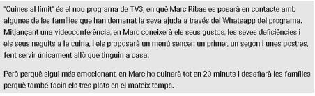 Però també aquest any passat el Marc es va aventurar amb el programa “Cuines al Limit”, on es un termini de 20 minuts es comprometia a fer tres plats, amb el que trobes ala nevera o al rebots dels participants, en un moment en que la pandèmia, ens tenia confinats i preocupats a casa…
