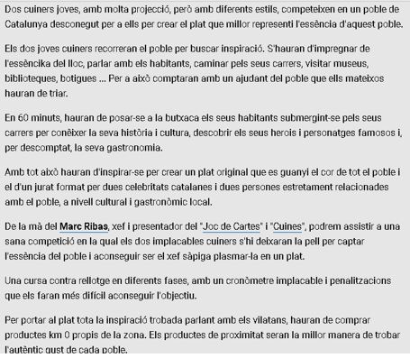 - Però també son cuiners joves, gent preparada que defensa una cuina creativa, en un mon i un moment difícil, on el nivell professional ha estat escombrat a una primera elit mundial, amb referents, i on cal ser dels millors. Per això arriscar la carrera de joves, amb una cursa show, es quelcom que no pot resumir el que pot donar de si aquest professional.