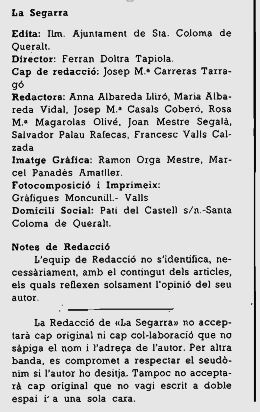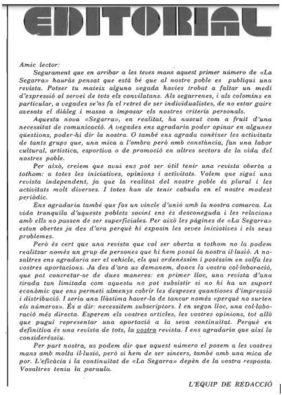 Hi ha quelcom que hem sembla molt important : la història de la Baixa Segarra no es podria, o podrà, entendre sense la consulta als continguts de la Revista, com a mitjà de comunicació local, per apropar-nos a una realitat que batega amb força, de vegades complexa, difícil, reivindicativa, encaixada físicament al límit de la província, però que manté una vitalitat associativa pròpia, singular, i amb empenta.