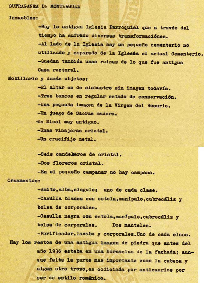 De vegades els documents, i arxius, són molt més del què consta a la referència o a la descripció, el seu context interior algunes vegades, permet descobrir detalls importants de la vida local; en aquest cas, es tracta d’un Inventari de l’Esglèsia de Sant Jaume de Montargull, de fa 58 anys, què ens descriu el detall del contingut dels seus objectes.