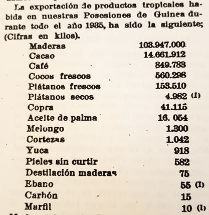 Aquest recull de les produccions, ja ens aporta algunes xifres : la tala i extracció de fusta tropical (basicament okumé) representa uns 9.078.917 kilos per mes de mitjana; en el cas del cacau, serien 1.221.826 kilos de mitjana per mes, tenint en compte que poden tenir dues collites l’any aproximadament, i enb el cas del café, 70.816 kilos de mitjana mensual, també amb una producció d’una collita l’any.